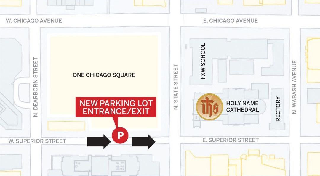 The Parking lot is located in the building directly across from the Cathedral. The entrance is at 14 W. Superior between Dearborn and State Street, is fully open for all Masses and Cathedral events and meetings. This is a private garage, designed solely for the use by the Archdiocese of Chicago and Holy Name Cathedral parishioners, visitors, and staff.